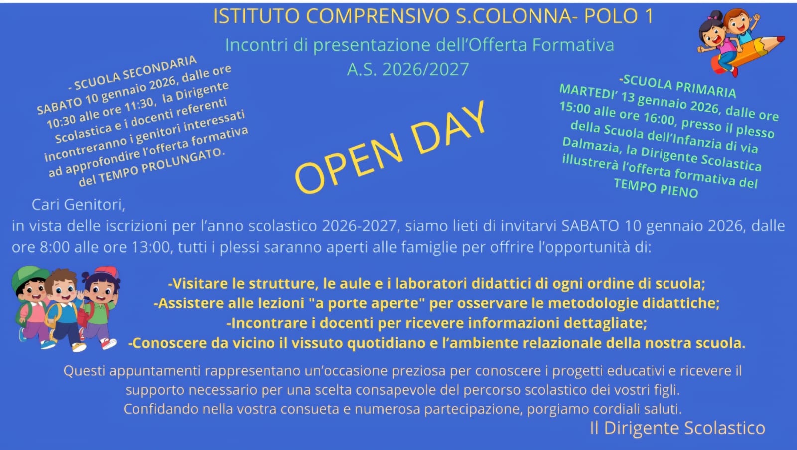 Cari Genitori, in vista delle iscrizioni per l’anno scolastico 2026-2027, siamo lieti di invitarvi Sabato 10 Gennaio 2026, dalle ore 8:00 alle ore 13:00 nel nostro Istituto. Tutti i plessi saranno aperti alle famiglie per offrire l’opportunità di: